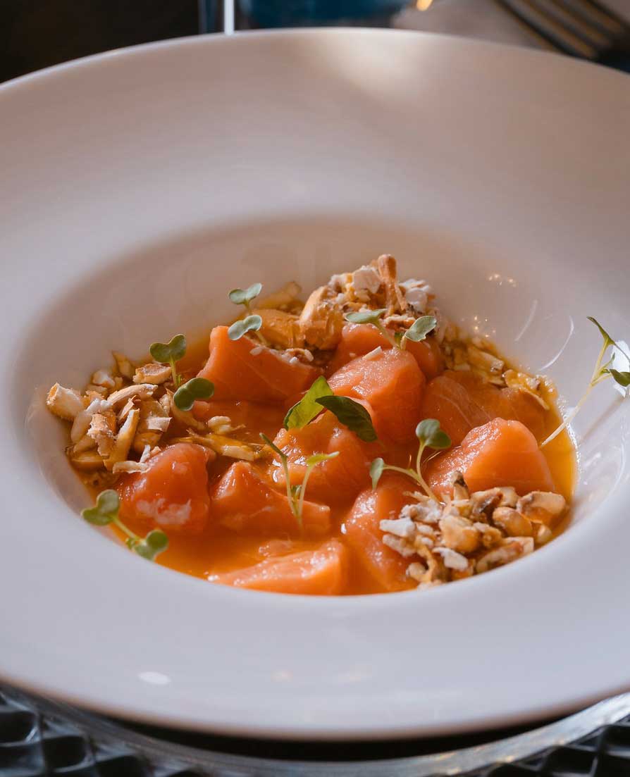 Dadolata di salmone crudo marinato in latte di tigre al ají amarillo e mais cancha